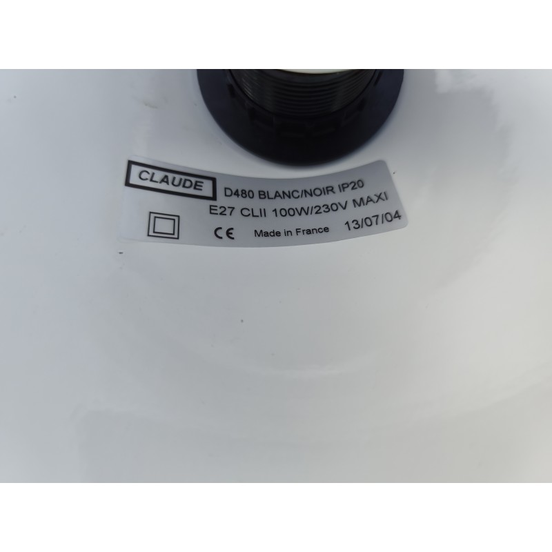 Lot de 7 Suspensions Industrielle en Tole émaillée , Blanc , liseré Plastic noir , Haut : 17 cm , Diam : 46,5 cm , poids : 1,150 Kg pièce , très bon état