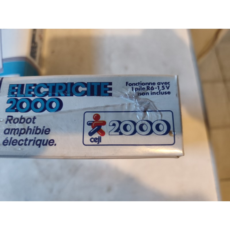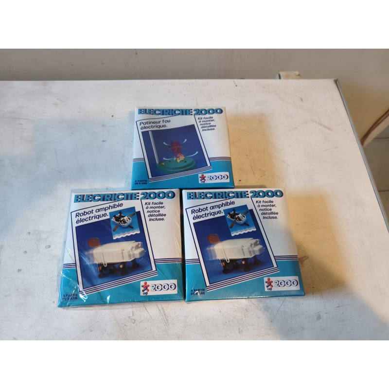 3 Jouets anciens Eletriciti 2000 CEJL, 2 Robots Amphibie electrique et 1 Patineur Fou , le tout marche avec pile R6 . 1,5 V , Boite sous blister , Diam : 15 cm