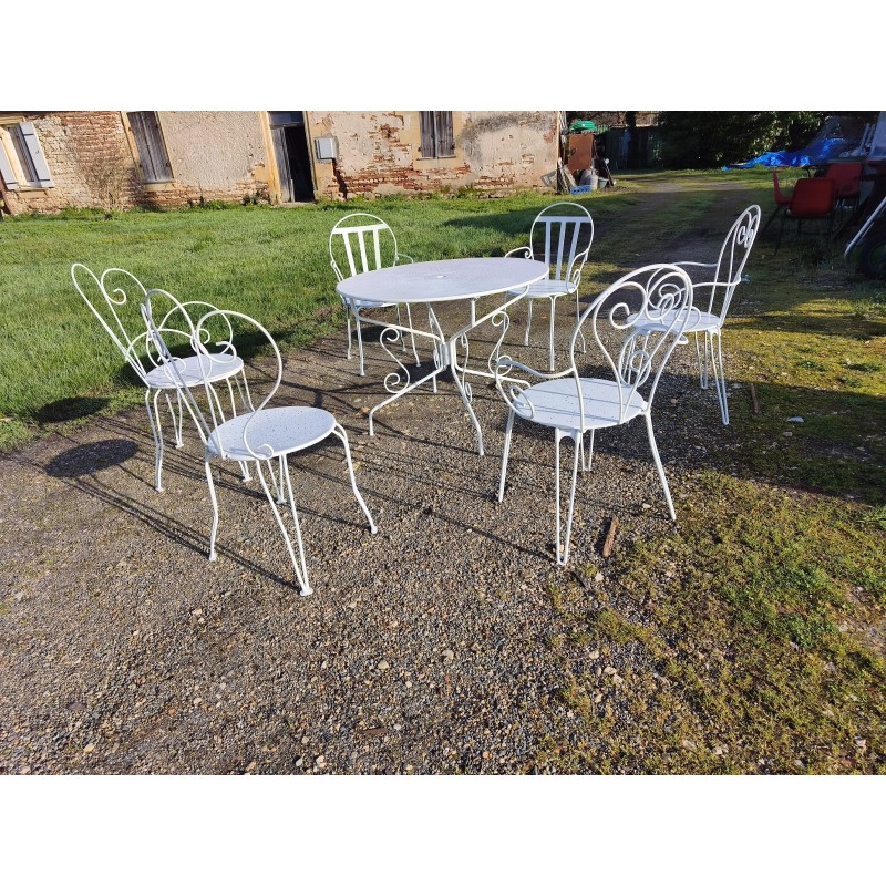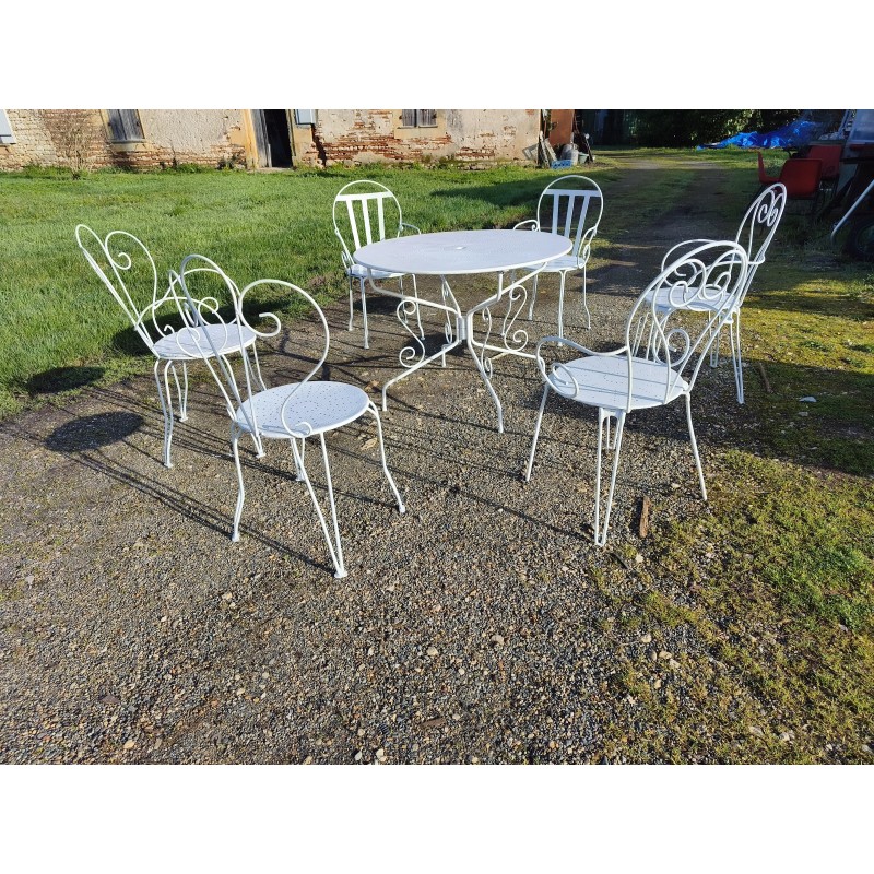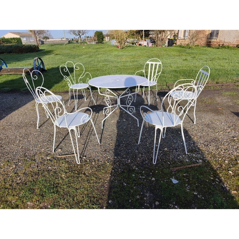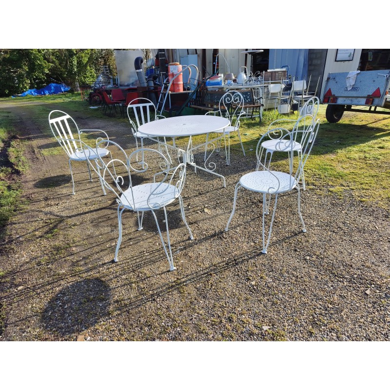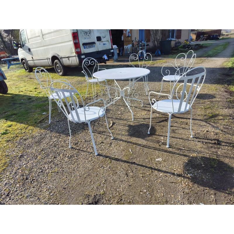 Salon de Jardin Fer Forgé 1900 avec 1 Table Ronde Haut : 72 cm , Diam : 95 cm , avec 5 Fauteuils et 1 chaise Dépareillée , 1 chaise et 1 Fauteuil ont étés ressoudées avec une assise bois sur 1 des chaise , donc ces 2 la sont a prendre avec le lot ou pas