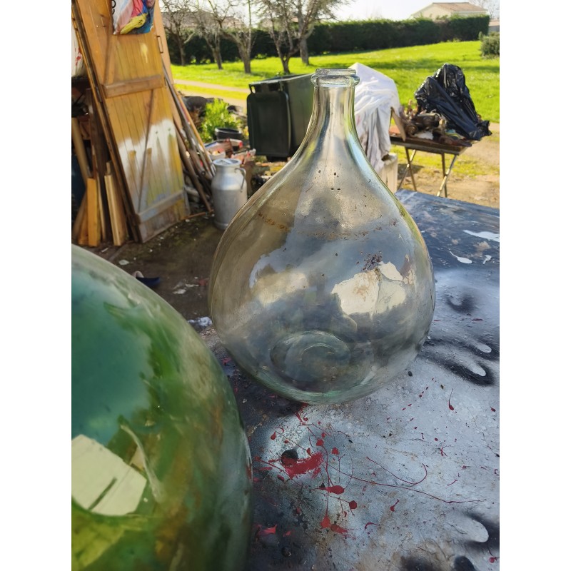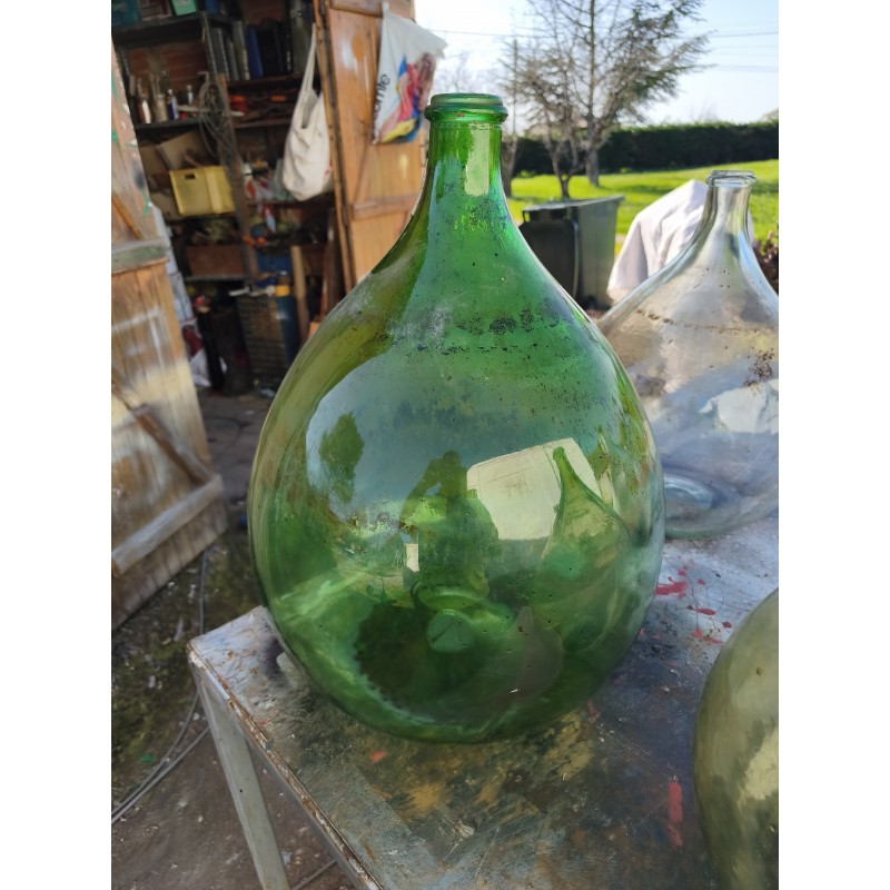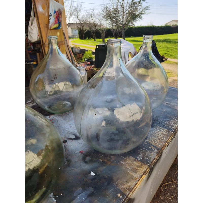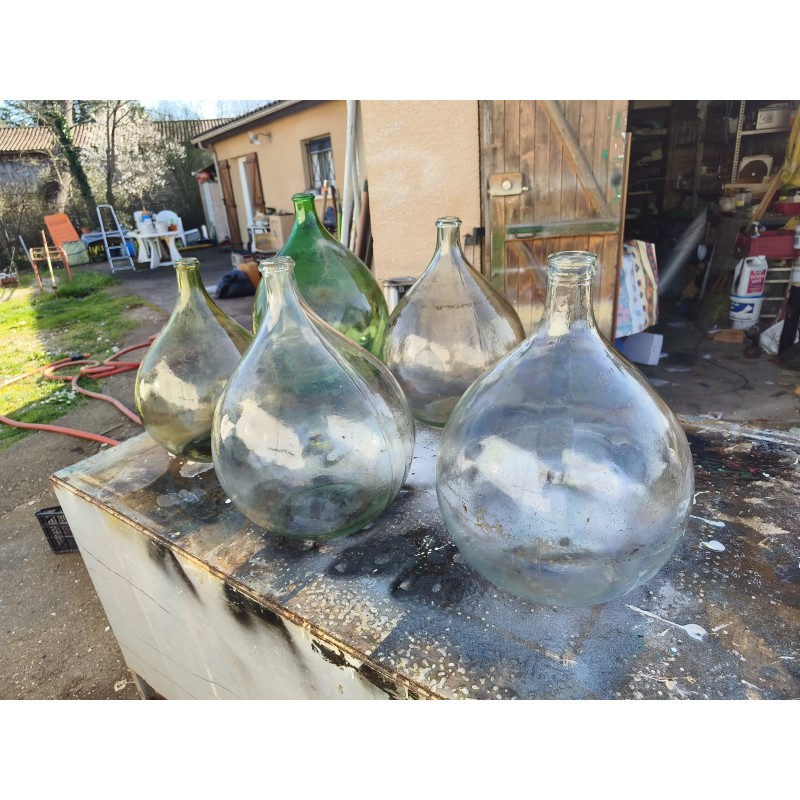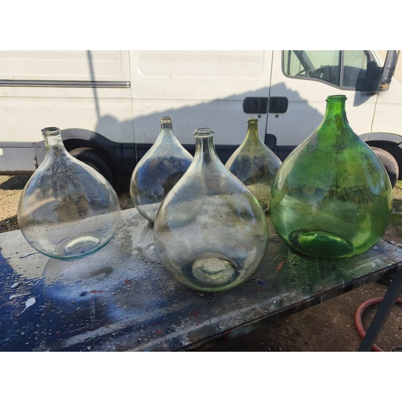Lot de 5 Dames Jeannes en Verre ancien , 4 de 20 L , Haut : 45 cm , Diam : 32 cm et 1 de 30 L , Haut : 51 cm , Diam : 37 cm , très bon état