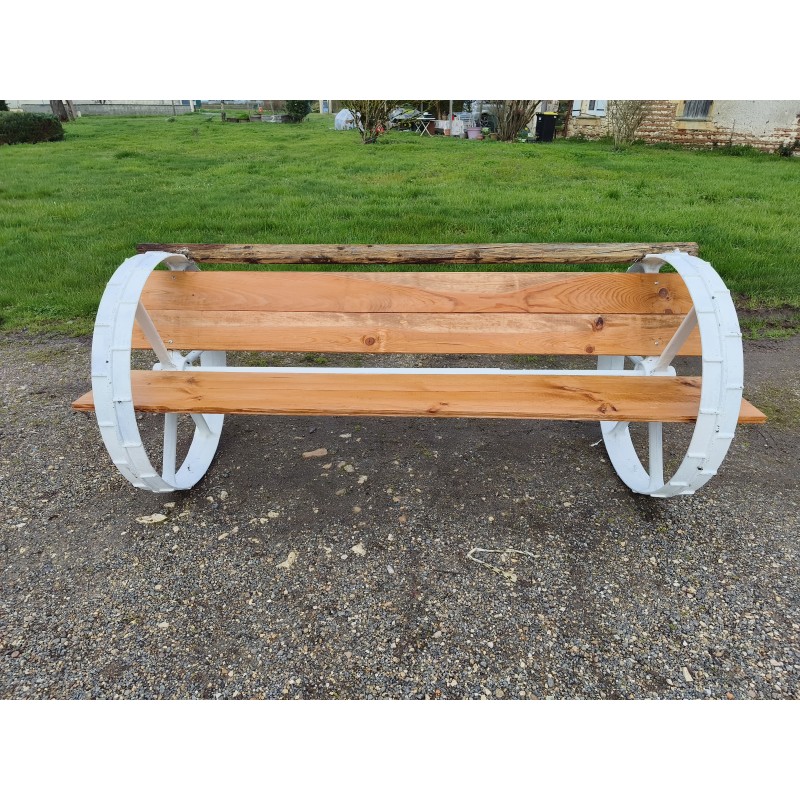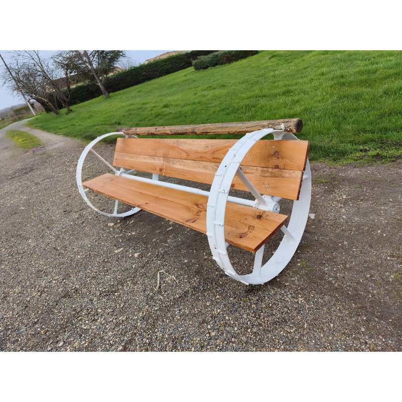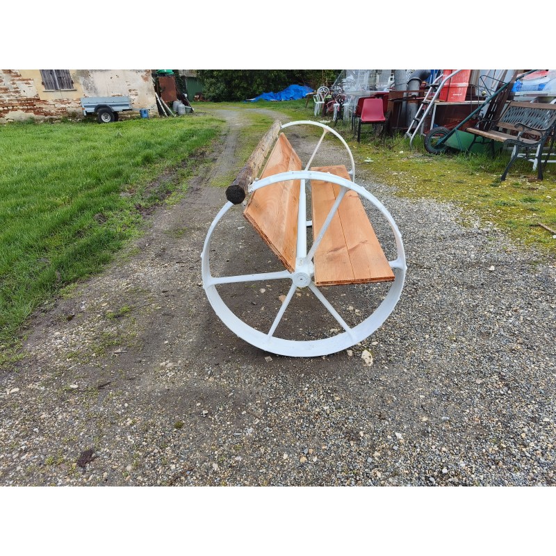 Banc Fonte et Bois Roues de Charrette ou de Machine Agricole 1900 , Haut : 82 cm , Haut d'Assise : 48 cm , long et larg : 200 cm sur 82 cm , très bon état