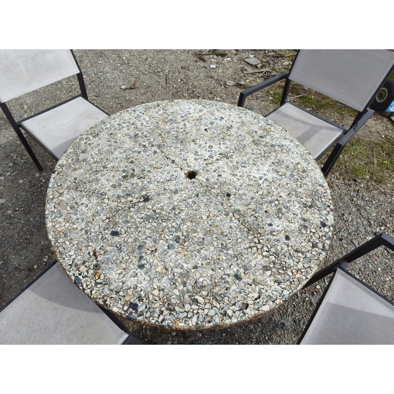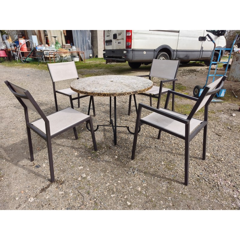 Salon de Jardin en Pierre et Piétement Fer Vintage des Années 70 , Table en Pierre reconstitué avec petits cailloux lisses , Haut : 70 cm , Diam : 97 cm et 2 Fauteuils et 2 Chaises Fer , Tissus imperméable , Haut : 86 cm , Haut d'assise : 46 cm , long et larg : 50 cm sur 55 cm , très bon état ,