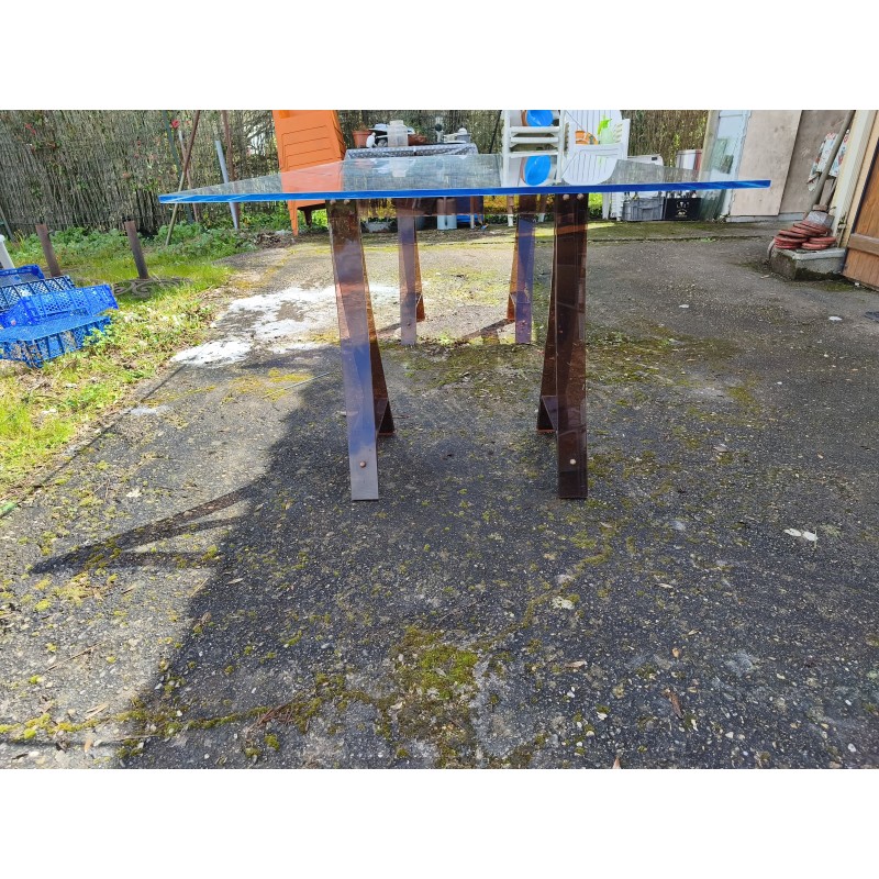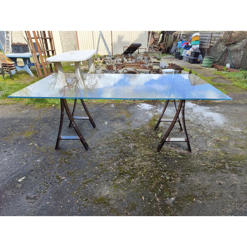 Table Vintage Plateau Verre sécurit Tréteaux Plastic Dur Fumé , Haut : 75 cm , long et larg : 200 cm sur 100 cm , épaisseur Plateau : 1,5 cm , Très bon état