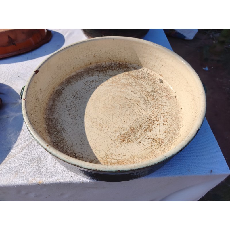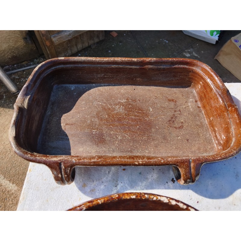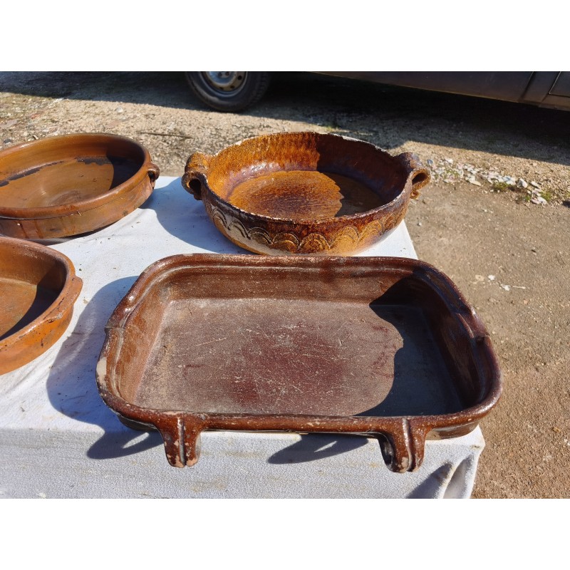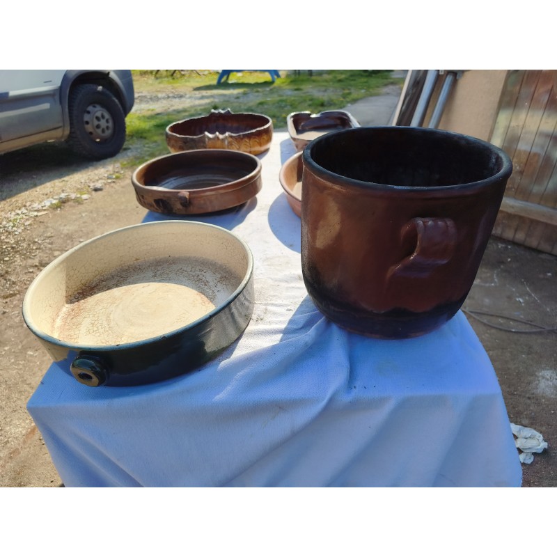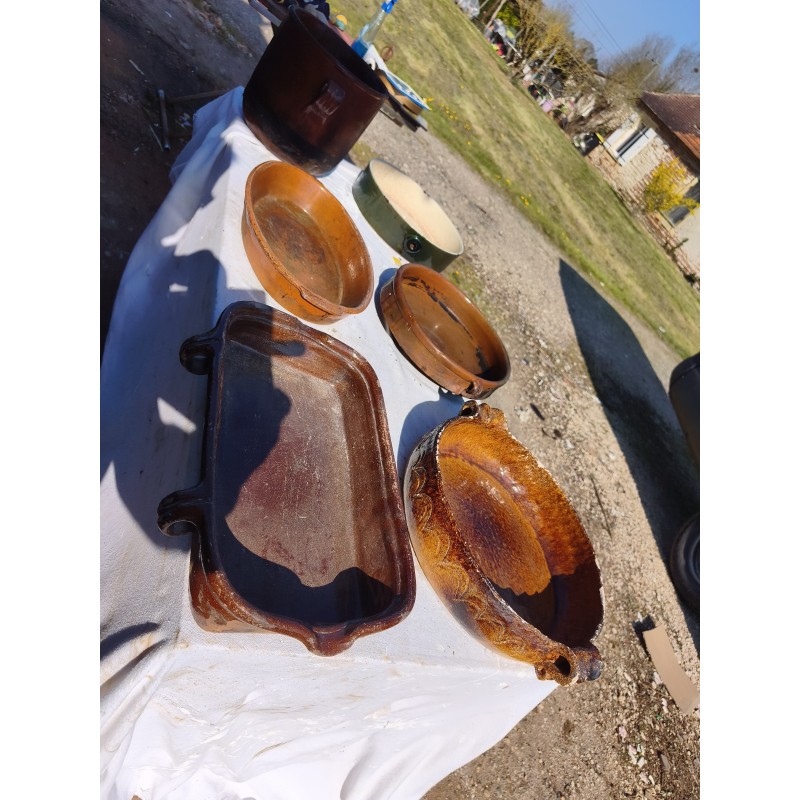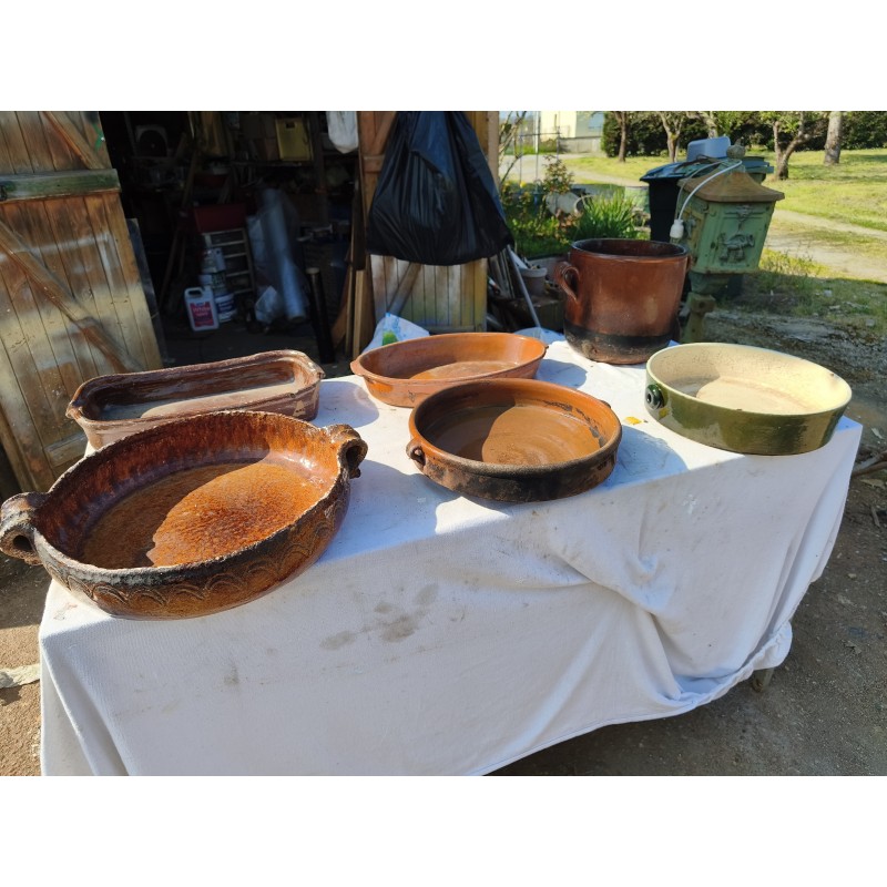 Lot de Poterie Ancienne en Grés , Leche Frites Haut : 7 cm , long et larg : 45 cm sur 28 cm , Plat rond 44 cm sur , 36 cm sur 33 cm et émaillé vert 33 cm sur 36 cm , Haut : 10 cm , Plat Ovale Haut : 7 cm , long et larg : 43 cm sur 27 cm , Pot Rond Haut : 25 cm , long et larg : 33 cm sur 25 cm , poids Total : 20 Kg , très bon état , dans leurs jus d'origine