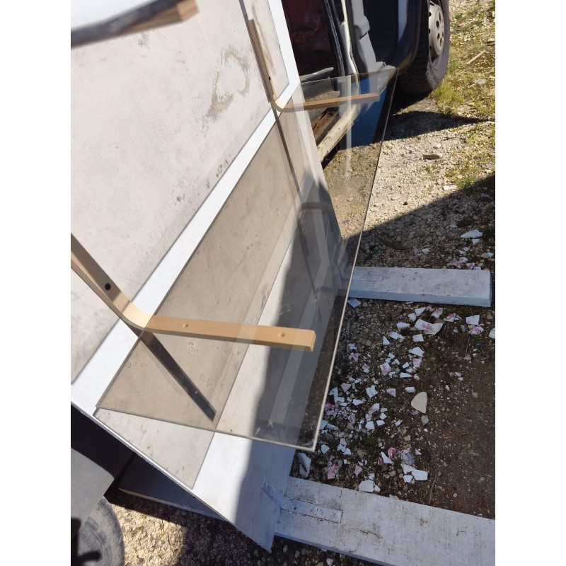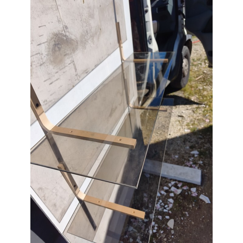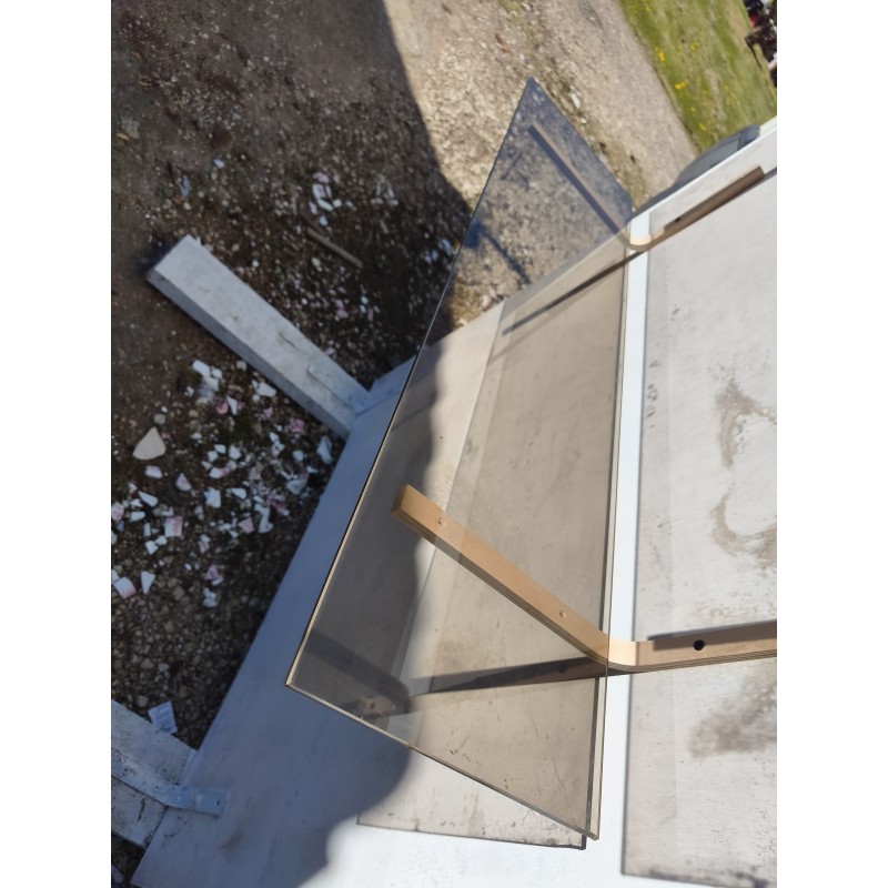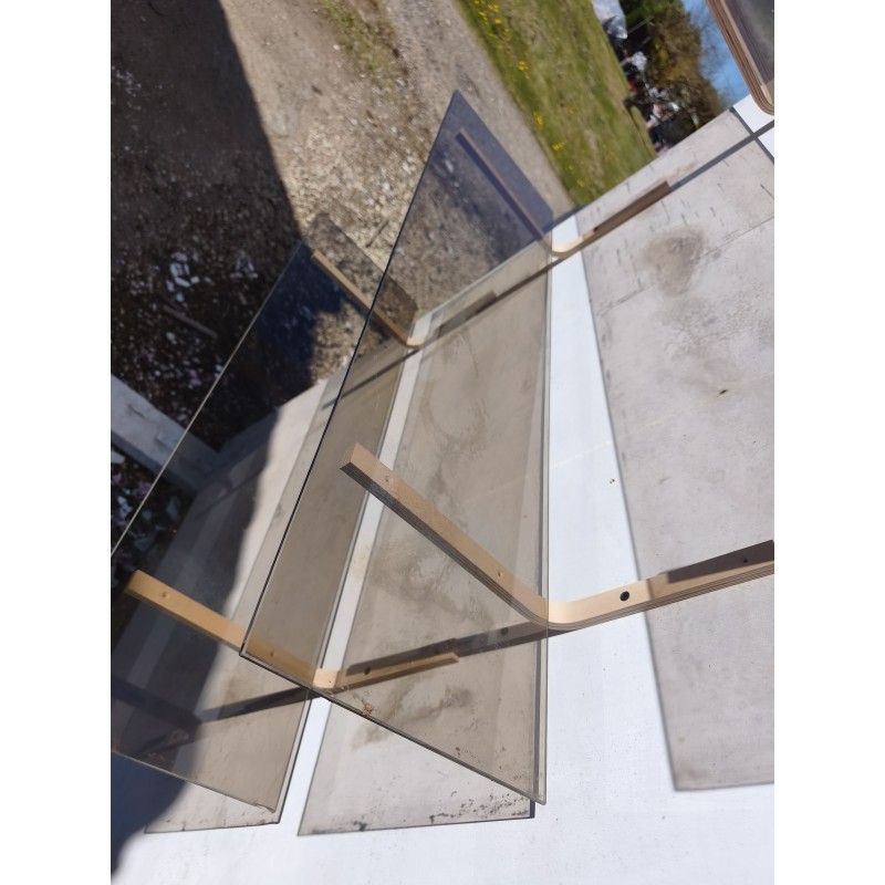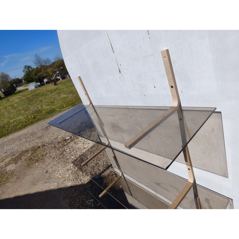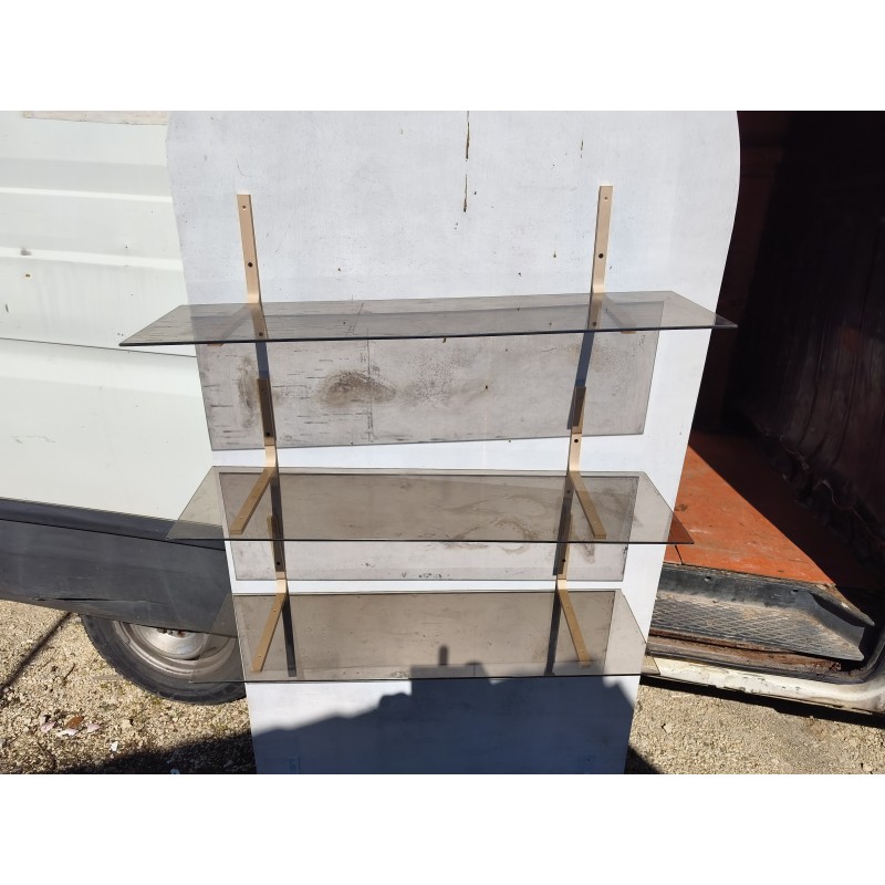 3 étagères en Verre Fumé , Dimensions : 90 cm sur 25 cm , épaisseur verre 0,5 cm , équerres bois , très bon état