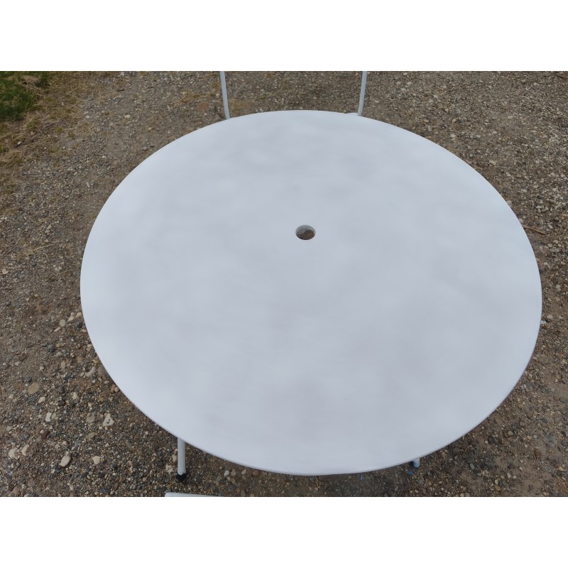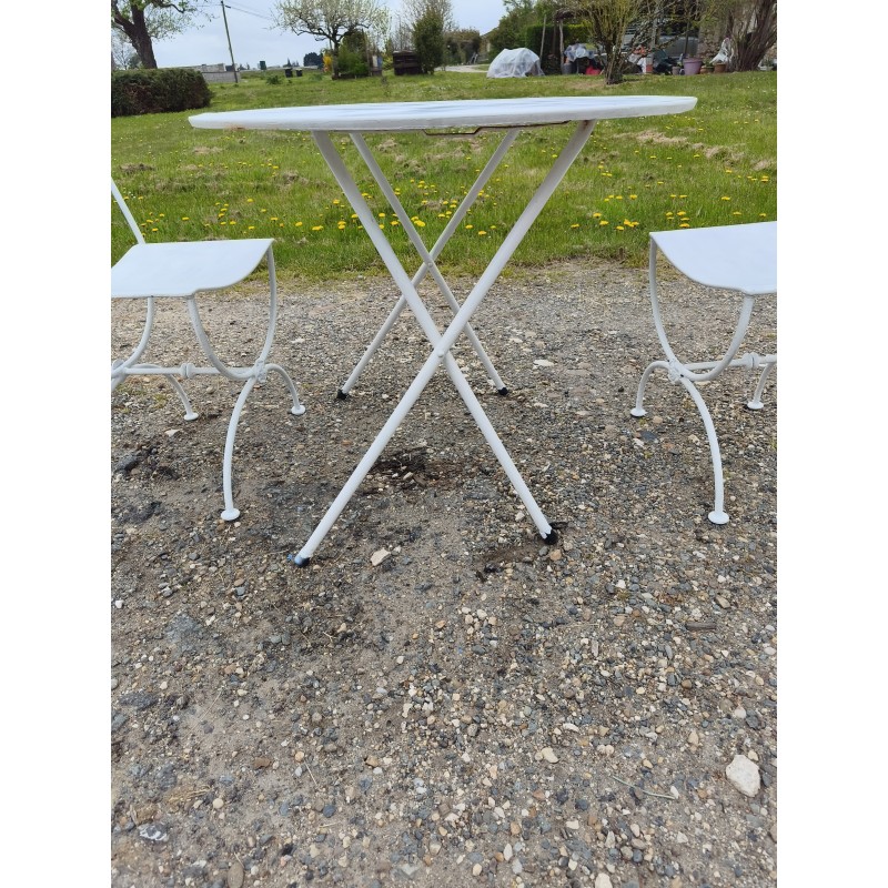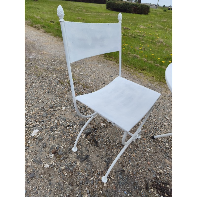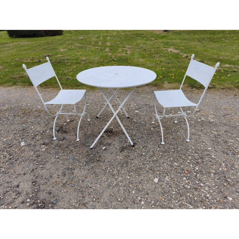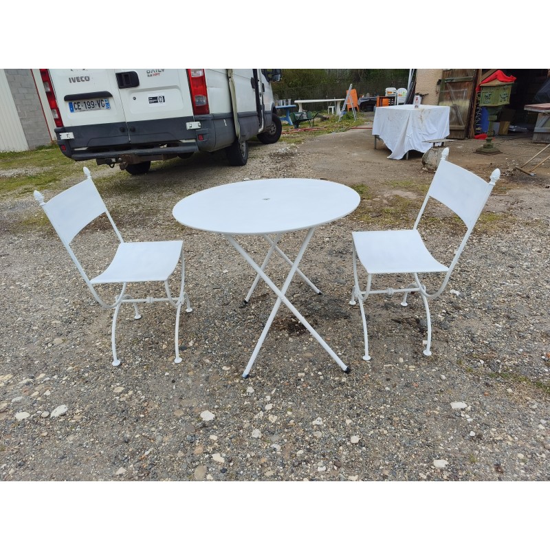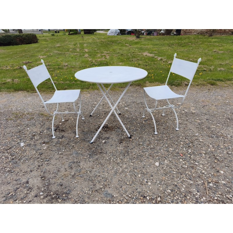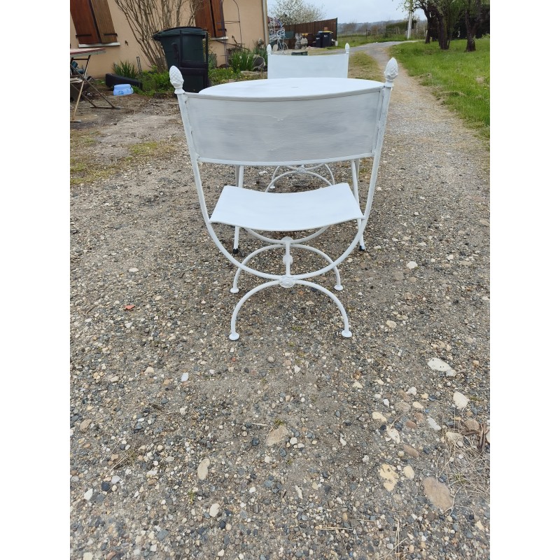 Salon de Jardin Fer Forgé , Table Ronde Fer , repliable , Haut : 70 cm , Diam : 80 cm , poids : 8 Kg et Paire de Chaises Curule , Fer Forgé , Haut : 84 cm , Haut d'assise : 45 cm , long et larg : 42 cm sur 48 cm , poids : 9 Kg pièce , très bon état