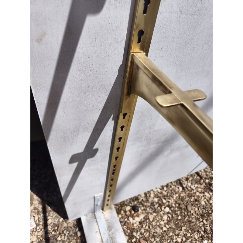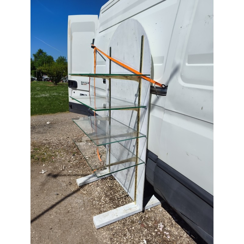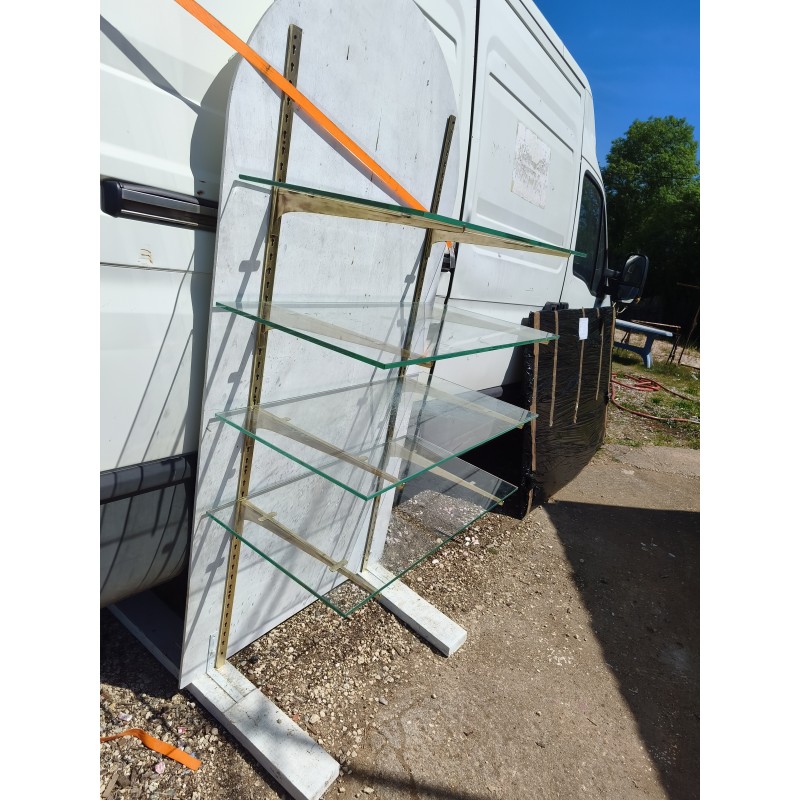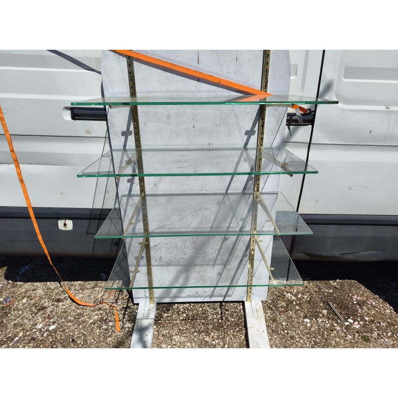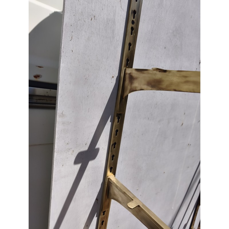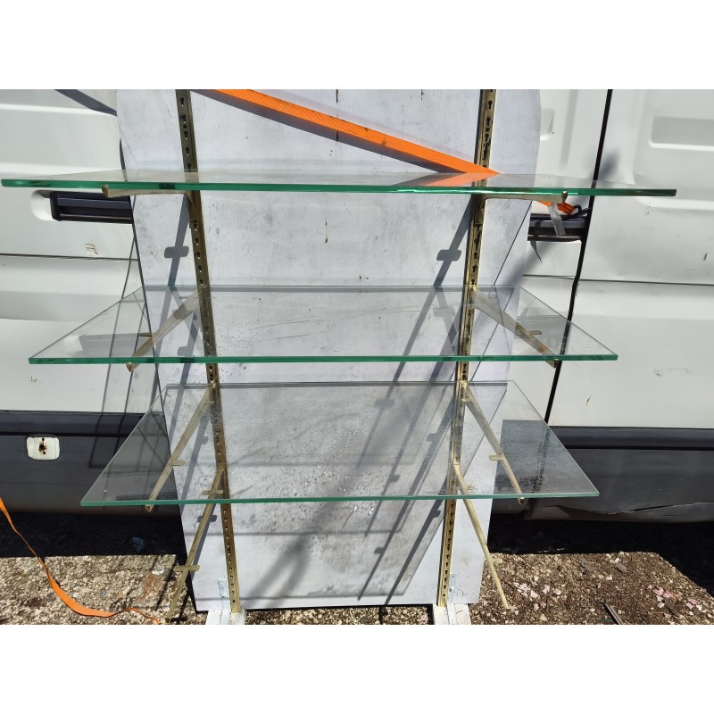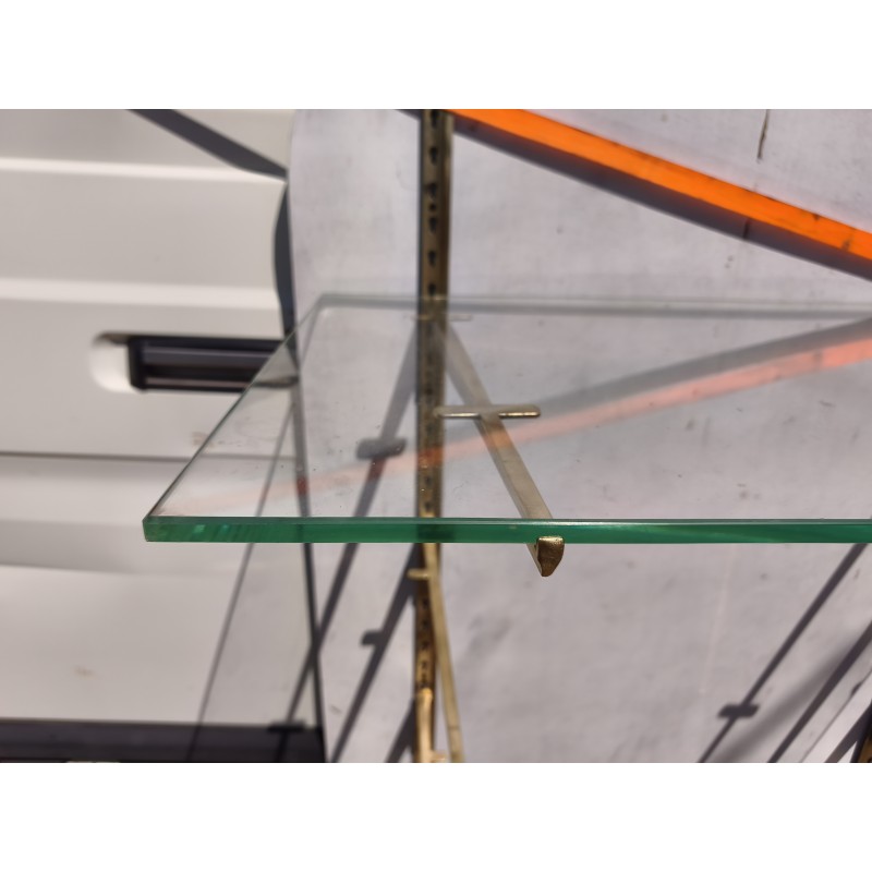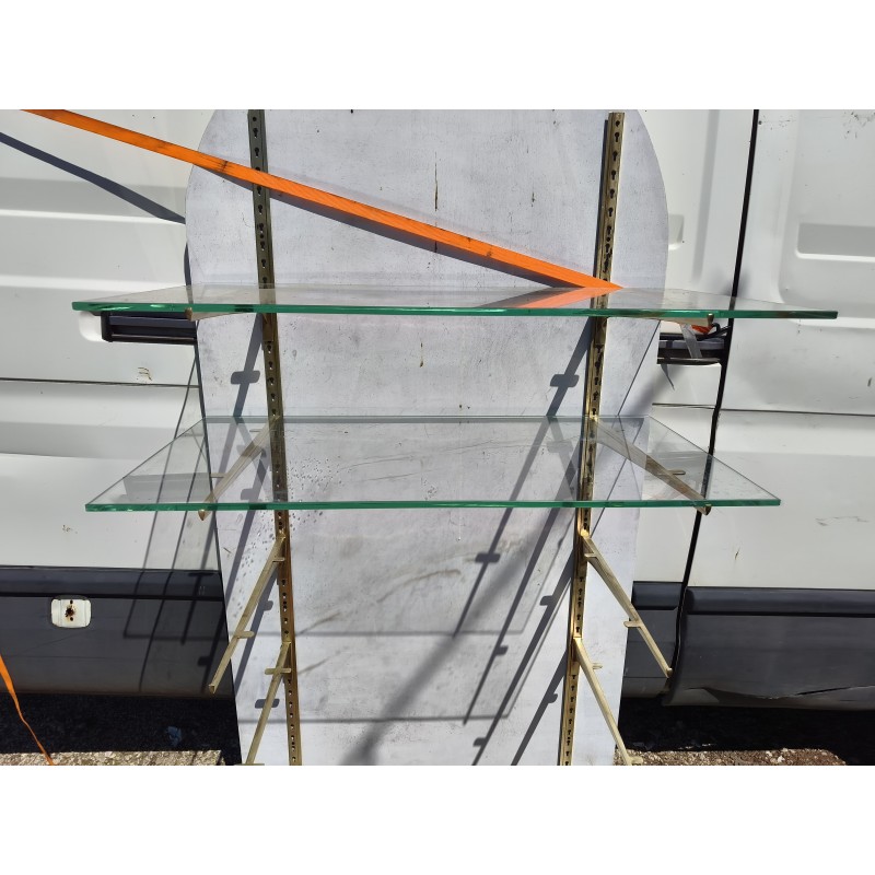 étagéres de Magasin 1900 en Bronze 5 Plateaux Verre Trempé , plateau verre trempé de 12,5 Kg pièce , long et larg : 99 cm sur 50 cm épaisseur 1 cm , 4 Paires d'équérres en Bronze +1 : long et larg : 50 cm sur 10 cm , épaisseur 2 cm , poids : 1 Kg pièce , 3 Tiges perforées de Maintien Haut : 180 cm , larg 3 cm , très bon état
