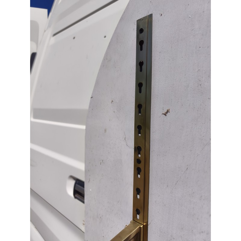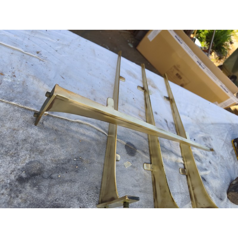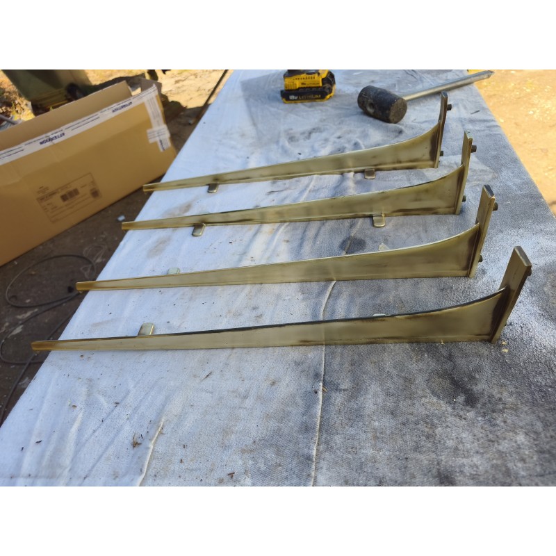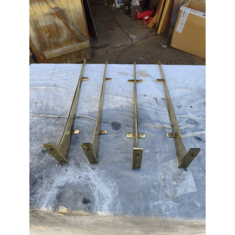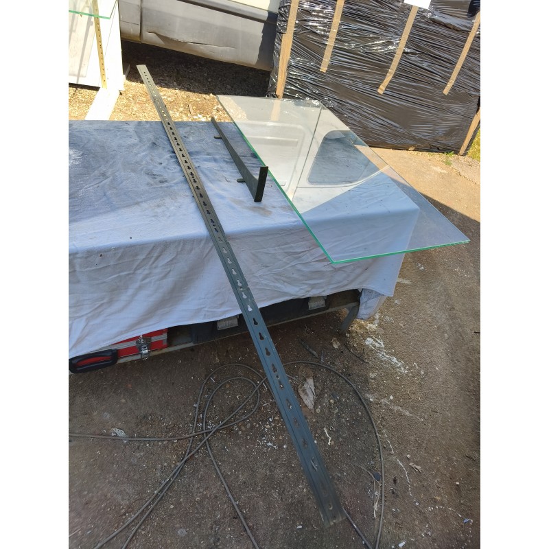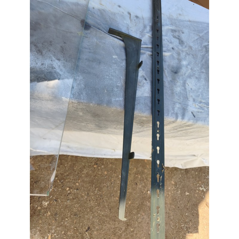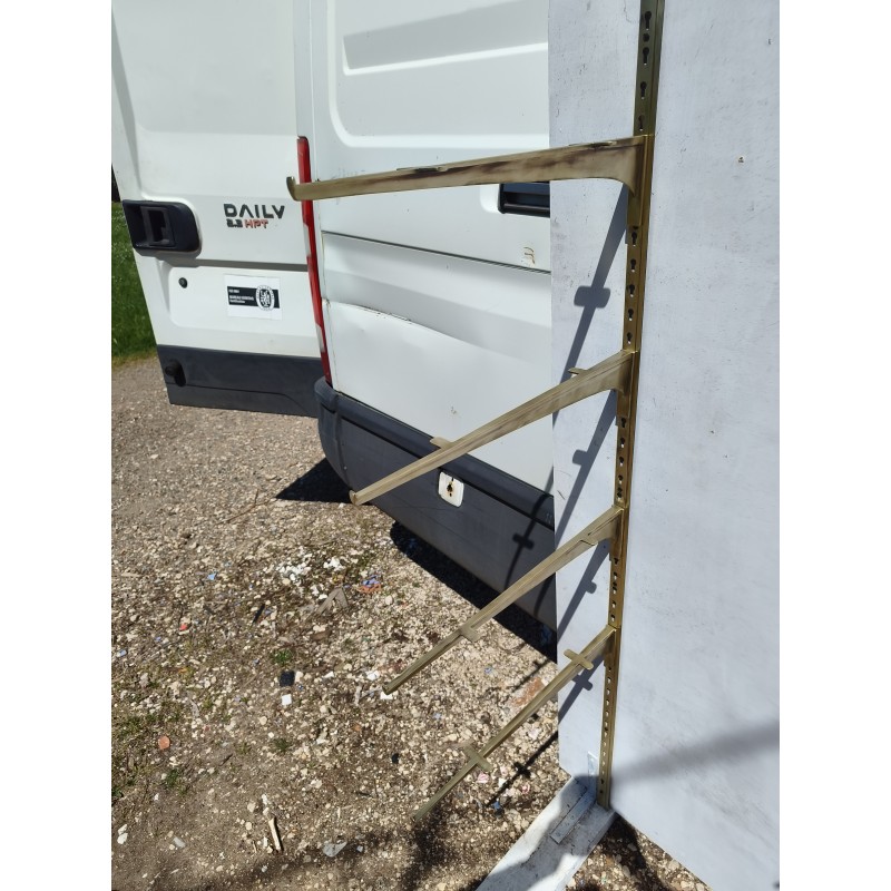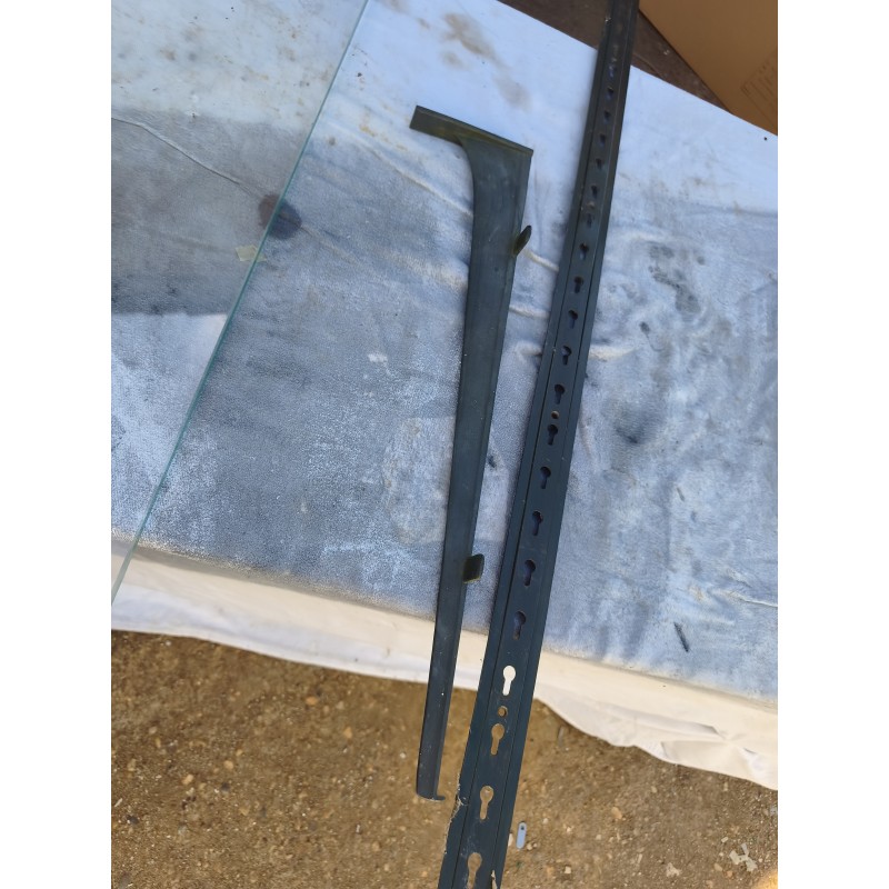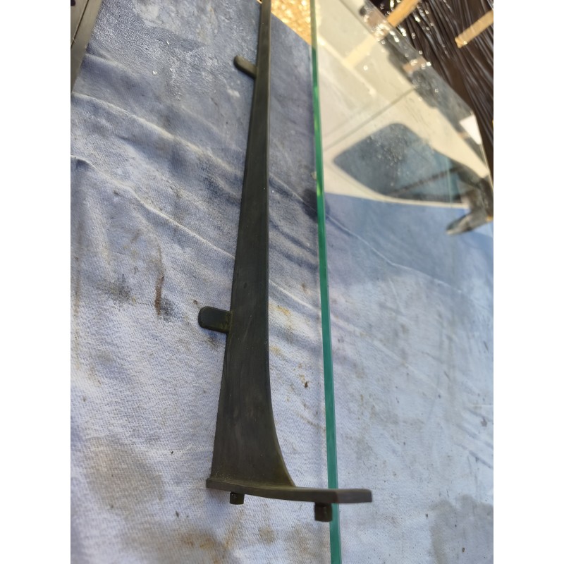 étagéres de Magasin 1900 en Bronze 5 Plateaux Verre Trempé , plateau verre trempé de 12,5 Kg pièce , long et larg : 99 cm sur 50 cm épaisseur 1 cm , 4 Paires d'équérres en Bronze +1 : long et larg : 50 cm sur 10 cm , épaisseur 2 cm , poids : 1 Kg pièce , 3 Tiges perforées de Maintien Haut : 180 cm , larg 3 cm , très bon état
