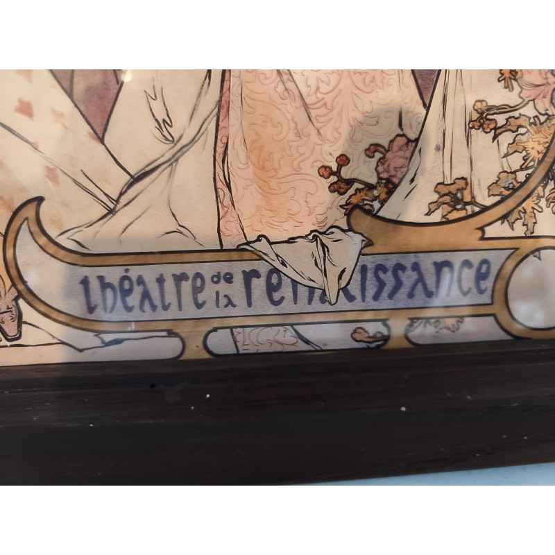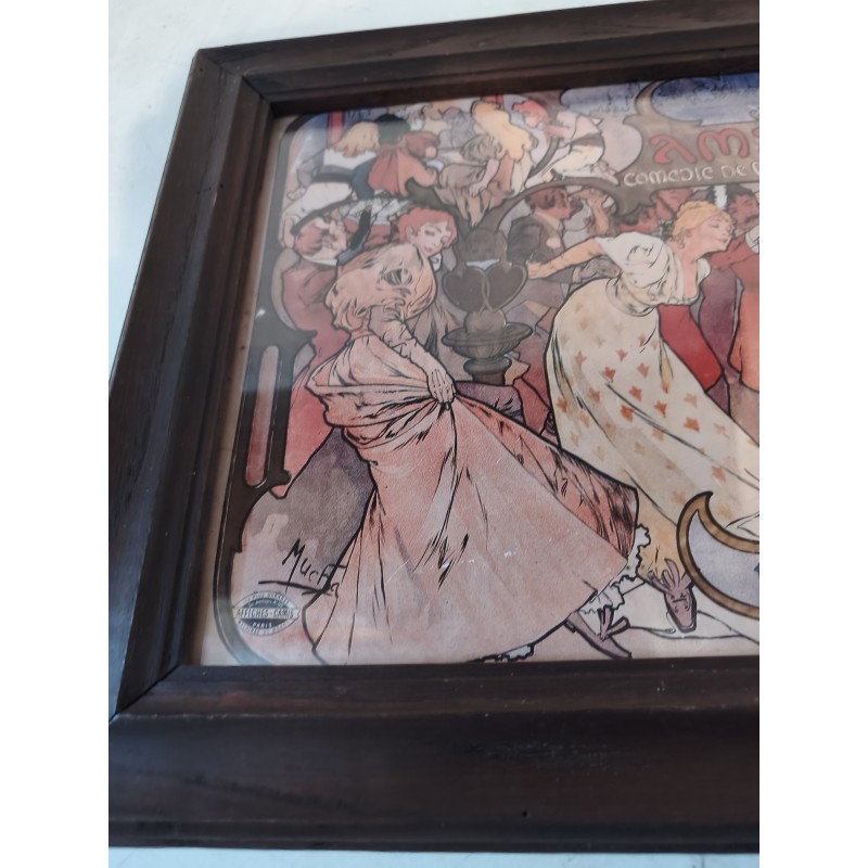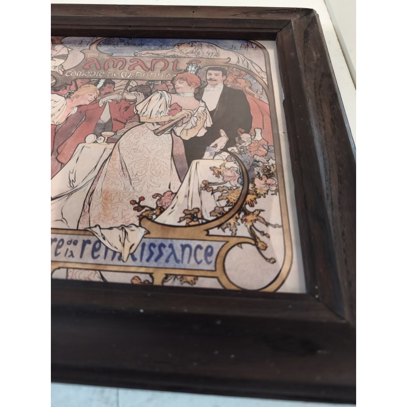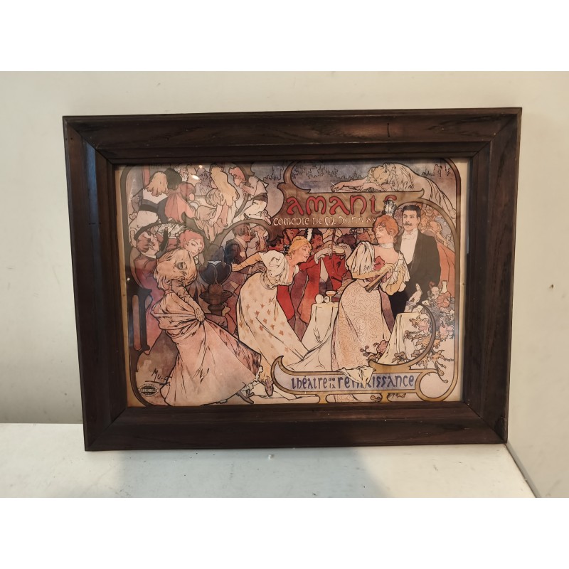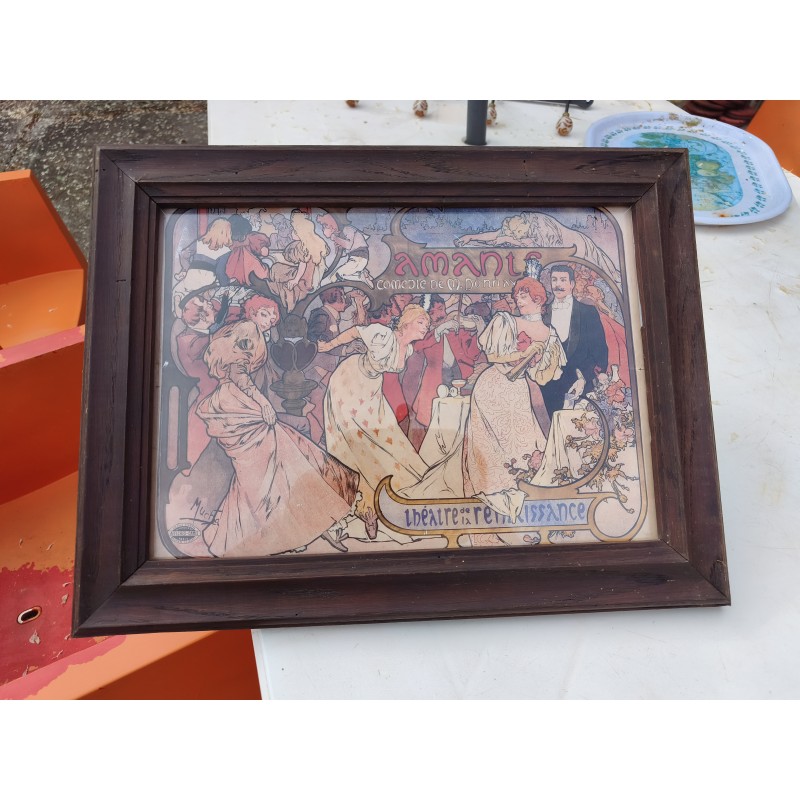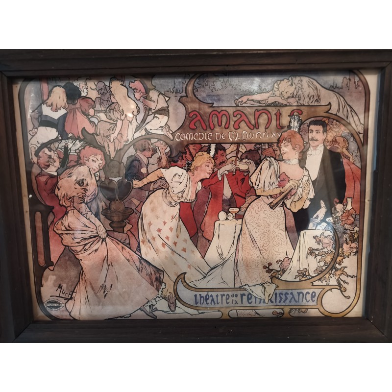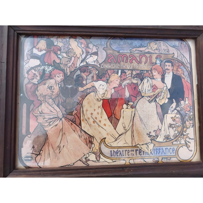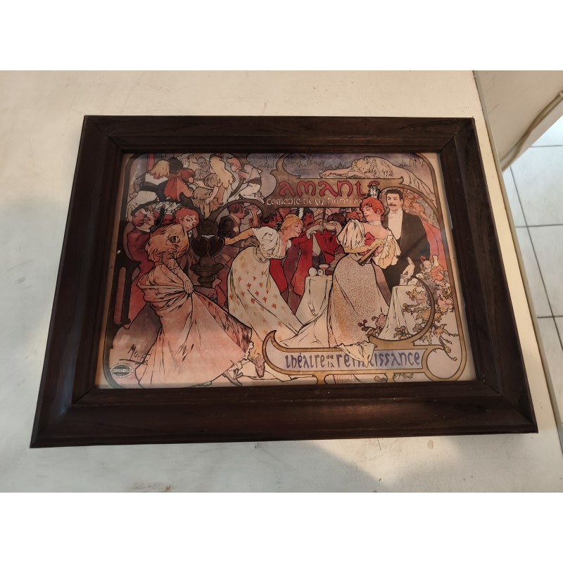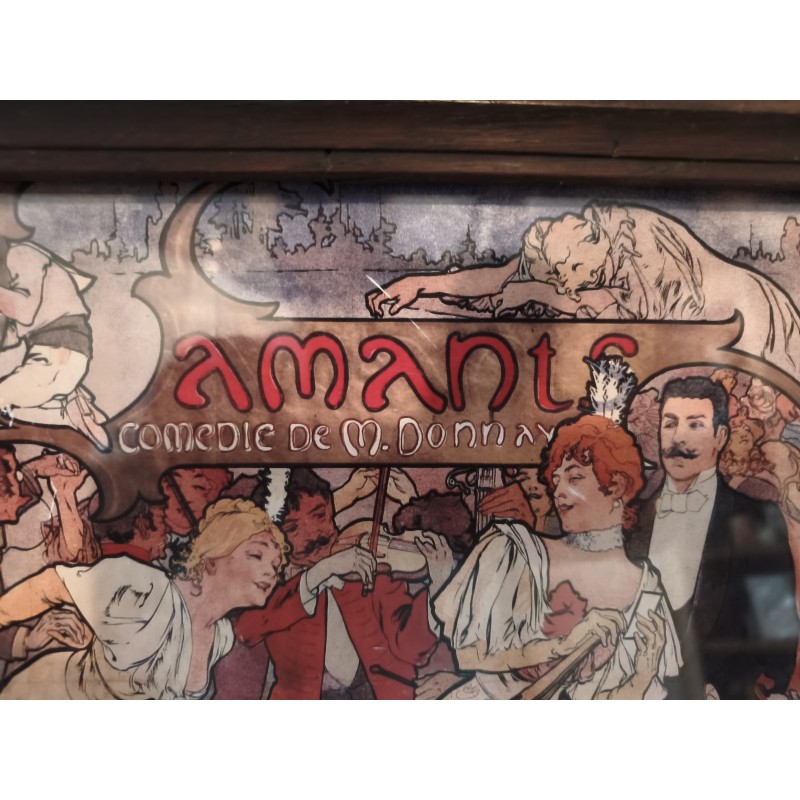 Affiche repro MUCHA encadrement bois sous verre , Thèatre de la Renaissance , " Amants " Comédie de M.Donnay , dimensions : 46 cm sur 35 cm , poids : 1,5 Kg , très bon état
