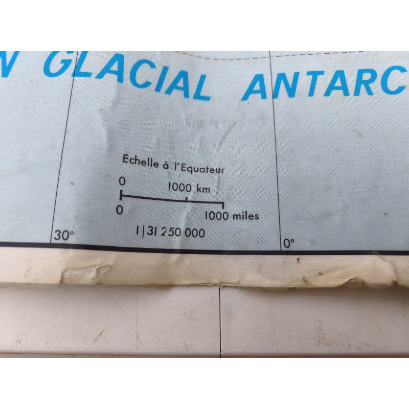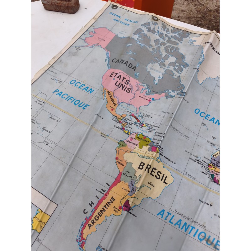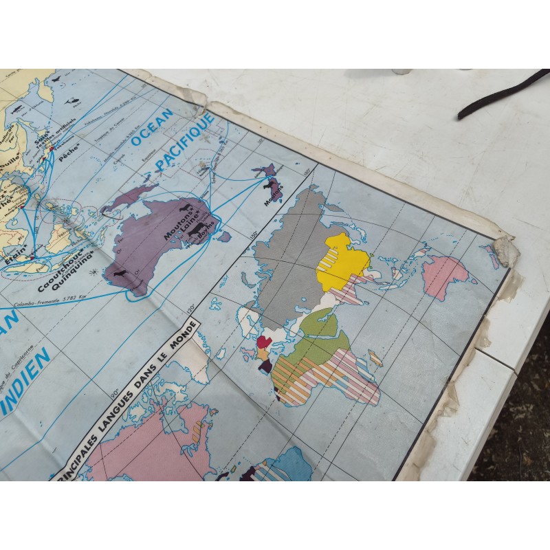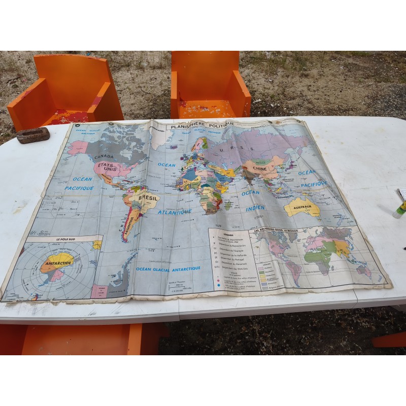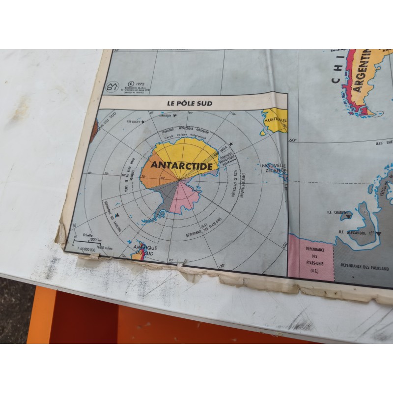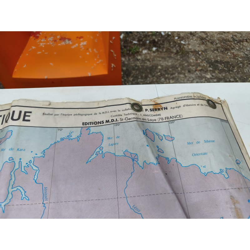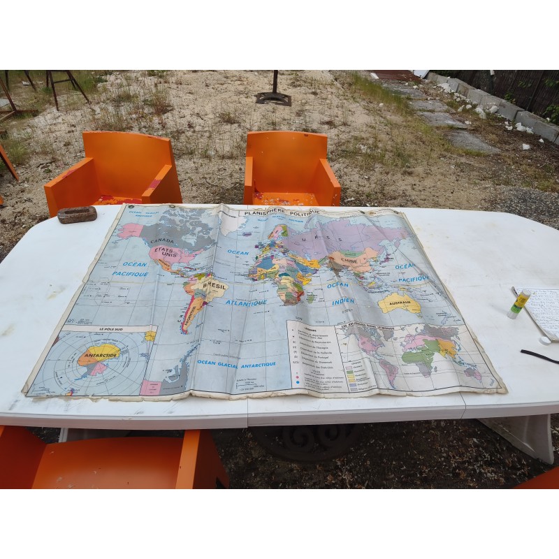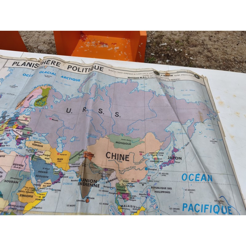 Carte du Monde Plastifiée par P.Serryn 1972 , dimensions : 123 cm sur 91 , Double façe , en l'état